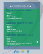 - Sub 12: (2010-2011). Pruebas: 80 mts. – 600 mts.- salto en largo - lanzamiento bala (3kg)
